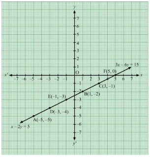 Now, plot the points D(-3, -4), E(-1, -3) and F(5, 0) on the same graph paper and join D, E and F to get the graph of 3x - 6y = 15.