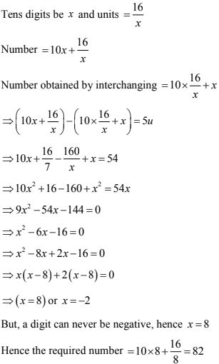 24. A two digit number is such that the product of the digits is 16. When 54 is subtracted from the number the digits are interchanged. Find the number .Solution